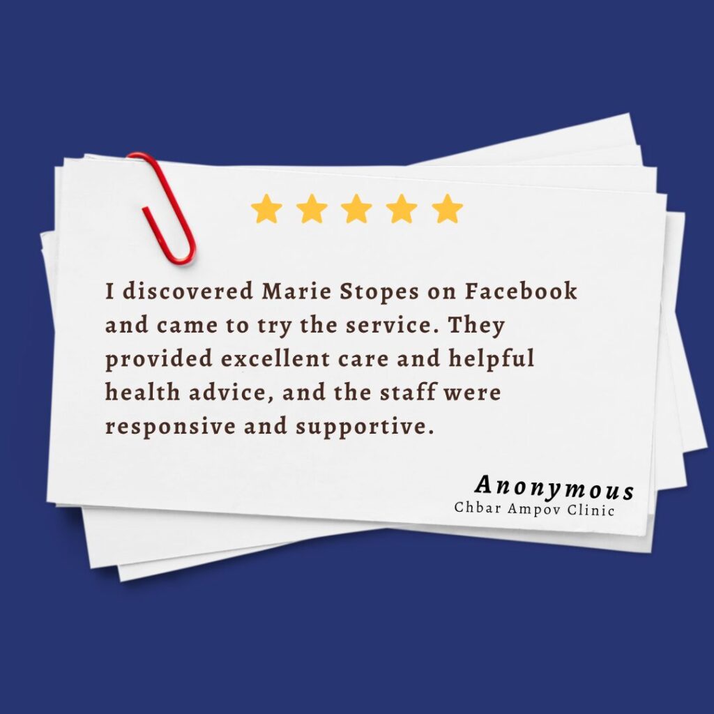Marie Stopes offers many reproductive health services for all stages of life from pre-menstruation to menopause. Our services include menstruation consultation, STIs treatment, contraception, safe abortion, pregnancy consultation, pap smear, menopause symptoms treatment and many more.